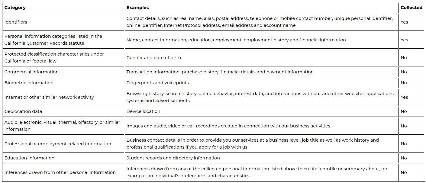 We have collected the following categories of personal information in the past twelve (12) months:
